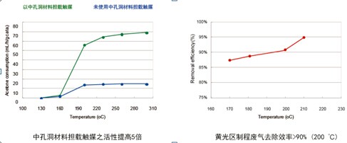 专利设计,以中孔材料担载的触媒活性提高5倍,在200℃时VOCs去除率即达90%以上。